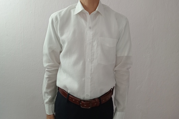 ワイシャツ。選んだ生地が硬くて、着心地はゴワゴワしたかんじ。生地選びで失敗。肩回りがちょっとだぶついている。
